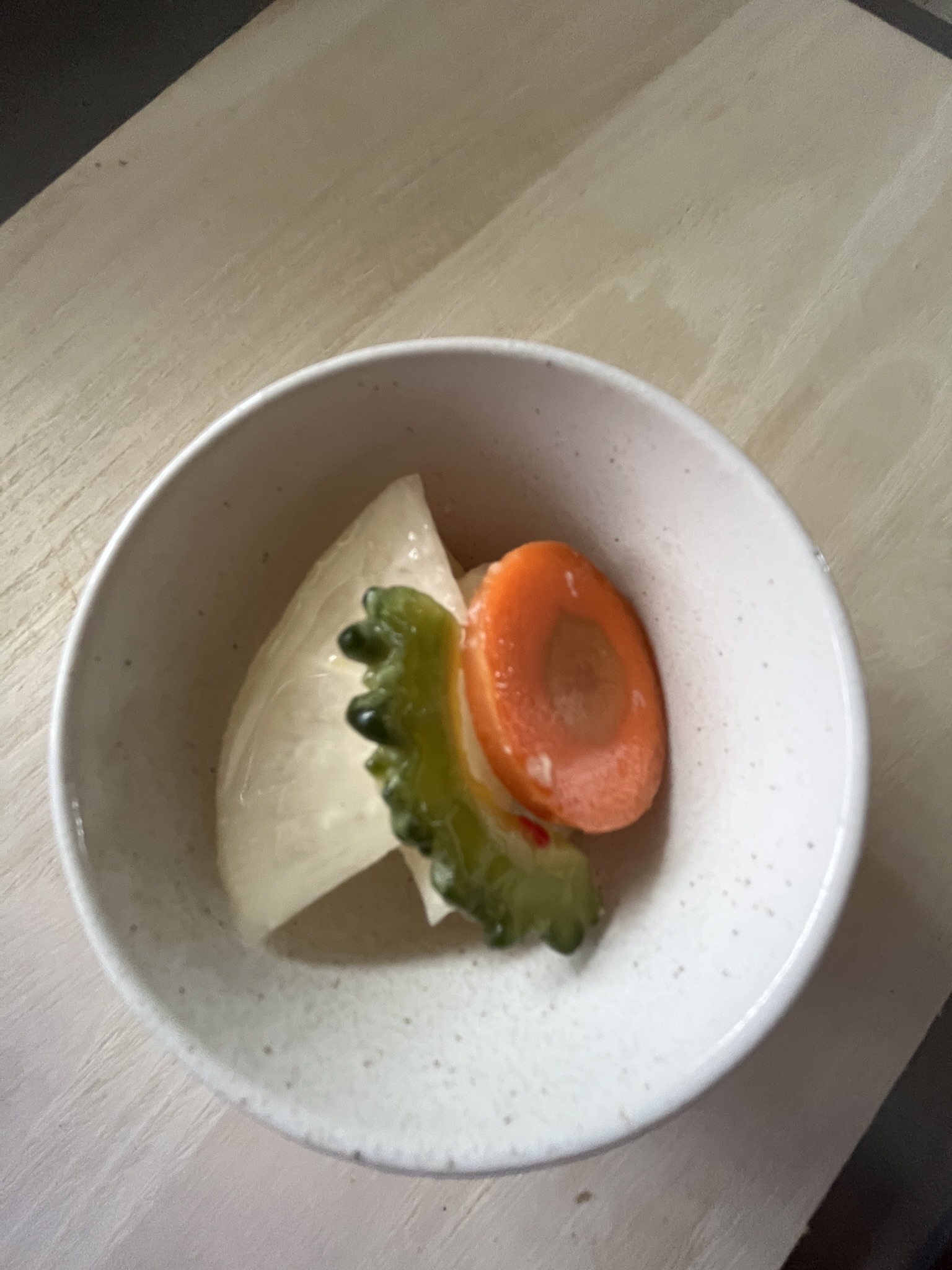 塩麹のべったら漬け Recipe 2023.03.14 目次 ■材料■作り方 ■材料 大根 約350g 塩 大さじ 1/2 塩麹 30g 砂糖 30g 唐辛子 小さじ 1/4 または わさび 5g ■作り方 ①材料を全て混ぜる ②蓋付き容器(ガラスまたはホーロー製)に入れて、冷蔵庫に入れて、6時間以上放置で出来上がり。 大根以外にもにんじん、きゅうりやゴーヤも美味しくできました。 レモン果汁やシーカーサー果汁を入れていただくと、柑橘の香りが加わり、味に立体感が出ます。 MAHALO